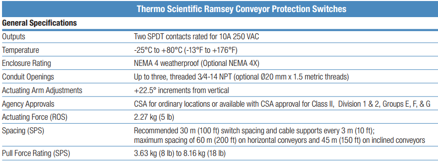 Thermo Scientifc Ramsey conveyor protection switches are used for position information, control signals, and to identify potentially hazardous situations with your process equipment. When hazardous situations occur they activate alarms to stop