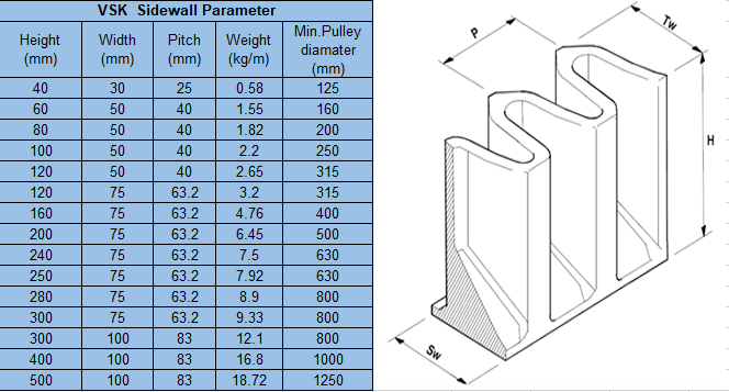 VSK sidewall use high quality of elstomer compound to make sure durability during runing through pulley and curving in high speed. For sidewall height below 120mm, VSK moulded sidewall are strong enough to support the material free from spillage. while the sidewall height over 120mm, special designed twill EP canvas as reinforcement material will be used to ensure the strenth always sufficient for various applications.